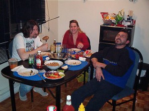 Petit souper avant la course entres les joueurs. De gauche à droite: Yves (D.M.S.), Roxanne (Resurection) et Herman (Kill & Destroy).