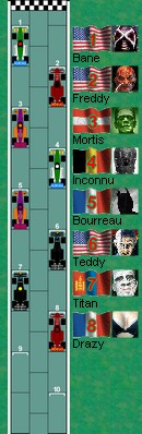 «Les feux rouges s'éteignent et on roule à Monza» ...et Freddy, 2e sur la ligne de départ, rate son départ et se fait aussitôt dépasser par Mortis et Inconnu le coup suivant. Bane est le premier à atteindre le premier virage et dès lors il accumule 2 coups d'avance sur les autres. Les deux pilotes K&D parviennent à prendre les devants sur le peloton arrière alors que le Bourreau réussit un coup de maître en empêchant les deux pilotes de Resurection à atteindre le premier virage. Le premier tour se poursuit alors que Bane est seul en avant et que Teddy réussit à remonter le peloton pour aller chercher la seconde place. Inconnu se retrouve en lutte entre les deux pilotes K&D alors que les deux pilotes DMS ferment le bal en arrière... Oups, j'oubliais les deux pilotes de Resurection qui semblent éprouver quelques difficultés en arrière! Le second tour: Bane continue de dominer la course alors que son coéquipier se voit en pleine lutte avec les deux pilotes de K&D. Un peu plus loin derrière, les deux pilotes de DMS continuent leur domination "arrière" alors que, encore plus loin derrière, les deux pilotes de Resurection continuent de dominer la "queue" arrière! La lutte entre les pilotes K&D et Inconnu avantage Titan qui parvient à prendre la seconde place, tout juste devant Teddy alors qu'Inconnu glisse en 4e place.