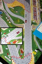 Steffe (voiture blanche) à la sortie du virage #9. En médaillon: